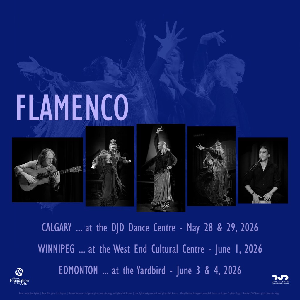 I’m thrilled to be back performing with my longtime friends and colleagues: dancers Claire Marchand (Vancouver/Winnipeg) and Rosanna Terracciano (Calgary); and guitarist Peter Mole (Vancouver); as we collaborate with returning guest singer and percussionist Francisco Orozco “Yiyi” (Spain), for an intimate evening of flamenco dance, guitar, piano, rhythm, and song. It’s a dream to travel with this show to my hometown of Calgary at the DJD Dance Centre, and then to Winnipeg at the West End Cultural Centre before bringing it home to Edmonton.