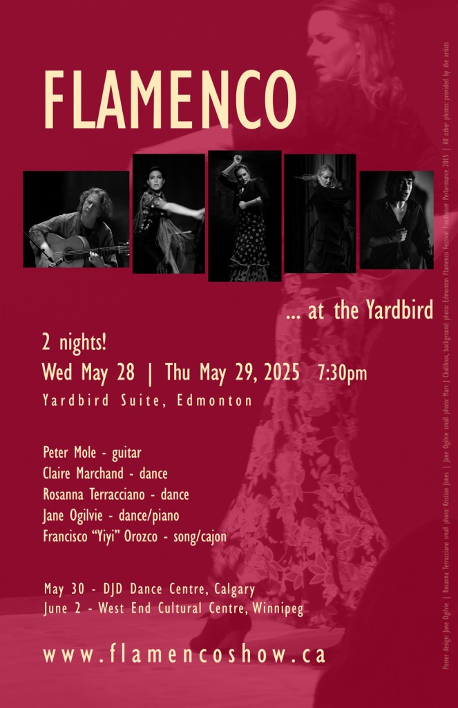 At long last I can announce that I will be back performing flamenco piano and dance this Spring. Join us for a night of Flamenco, live and up close, in Edmonton’s premier jazz venue, Yardbird Suite. Last year’s show sold out weeks in advance. We’re so pleased the Yardbird was able to offer us 2 nights this year.