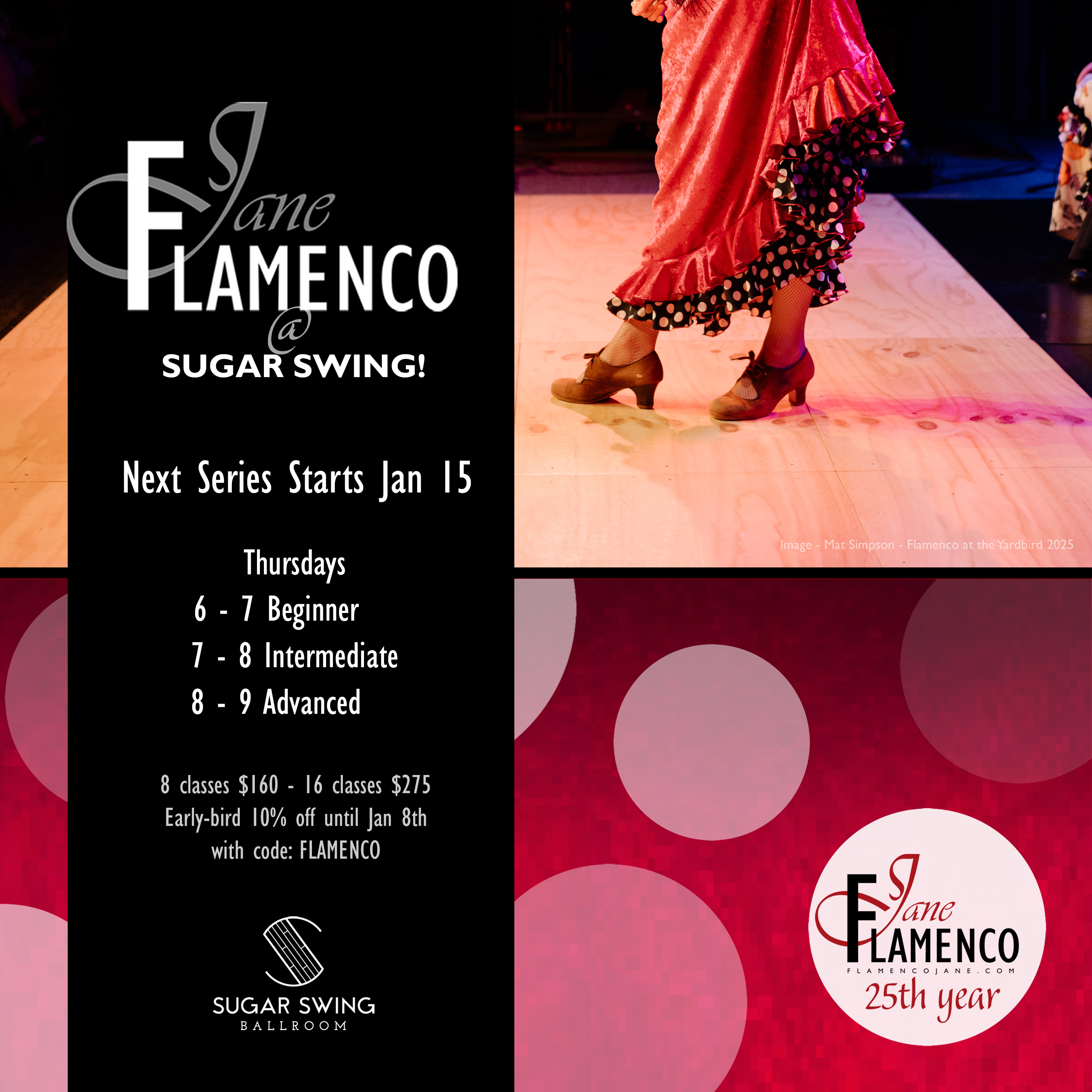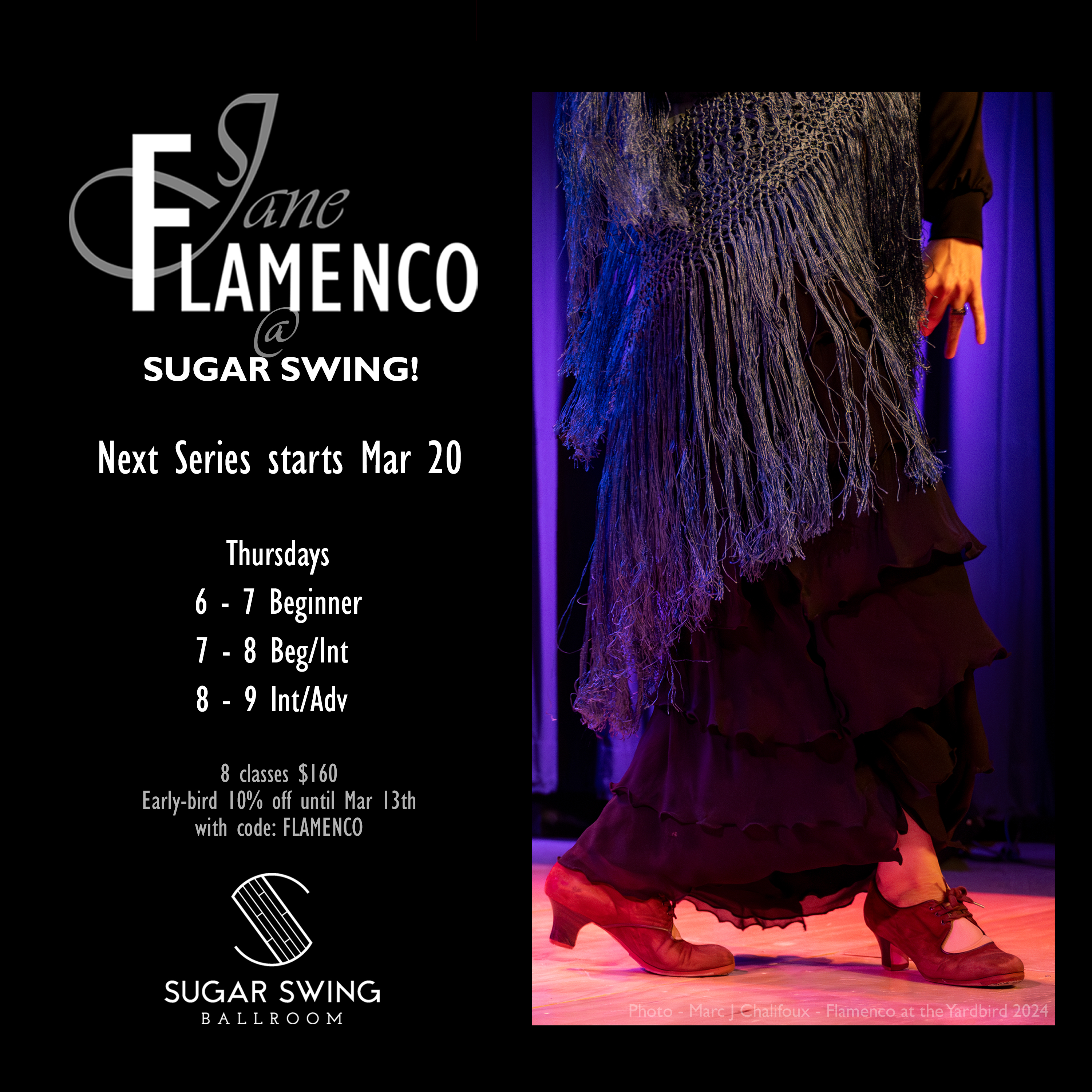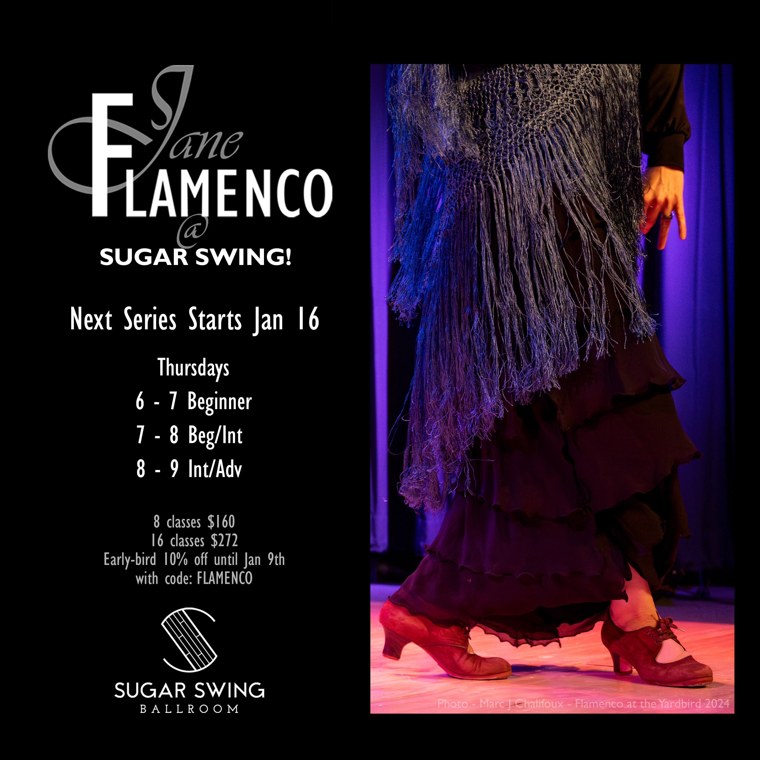 *Students currently registered in flamenco at Sugar Swing receive an additional 15% off.